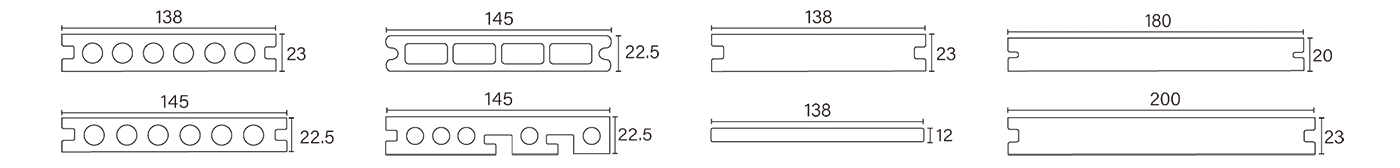Our co-extruded WPC decking boards are available in various hollow decking profiles, including round-hole structures, with flexible dimensions such as 140–150mm width and 20–25mm height, as well as customized lengths like 3900mm.